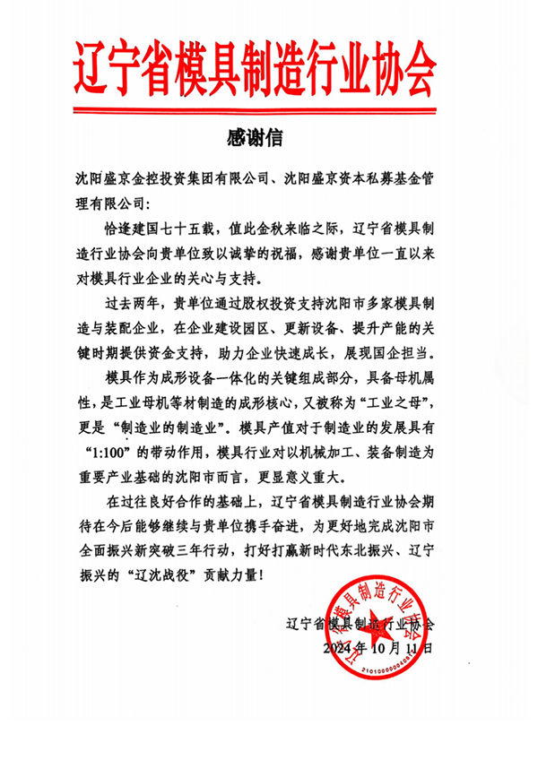 10月11日,盛京金控集团收到感谢信,辽宁省模具制造行业协会对集团一直以来对模具行业企业的关心与支持表示感谢。盛京金控通过所属子公司盛京资本管理的中小企业基金对锦达集团、中航迈瑞特、中金模具、信兴汽车等模具企业合计投资1200万元,有效助力模具产业转型发展。